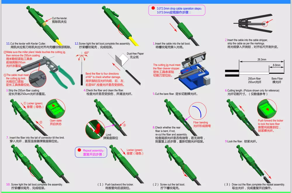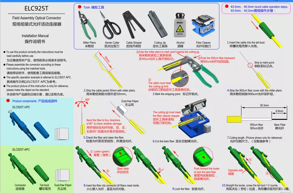 Conector rápido LC/APC ELC925T-APC para cabo drop de 2,0 x 3,0 mm, 1,6 x 2,0 mm, cabo interno de 3,0 mm e 2,0 mm, cabo invisível de 0,9 mm, conector de montagem de campo de fibra óptica